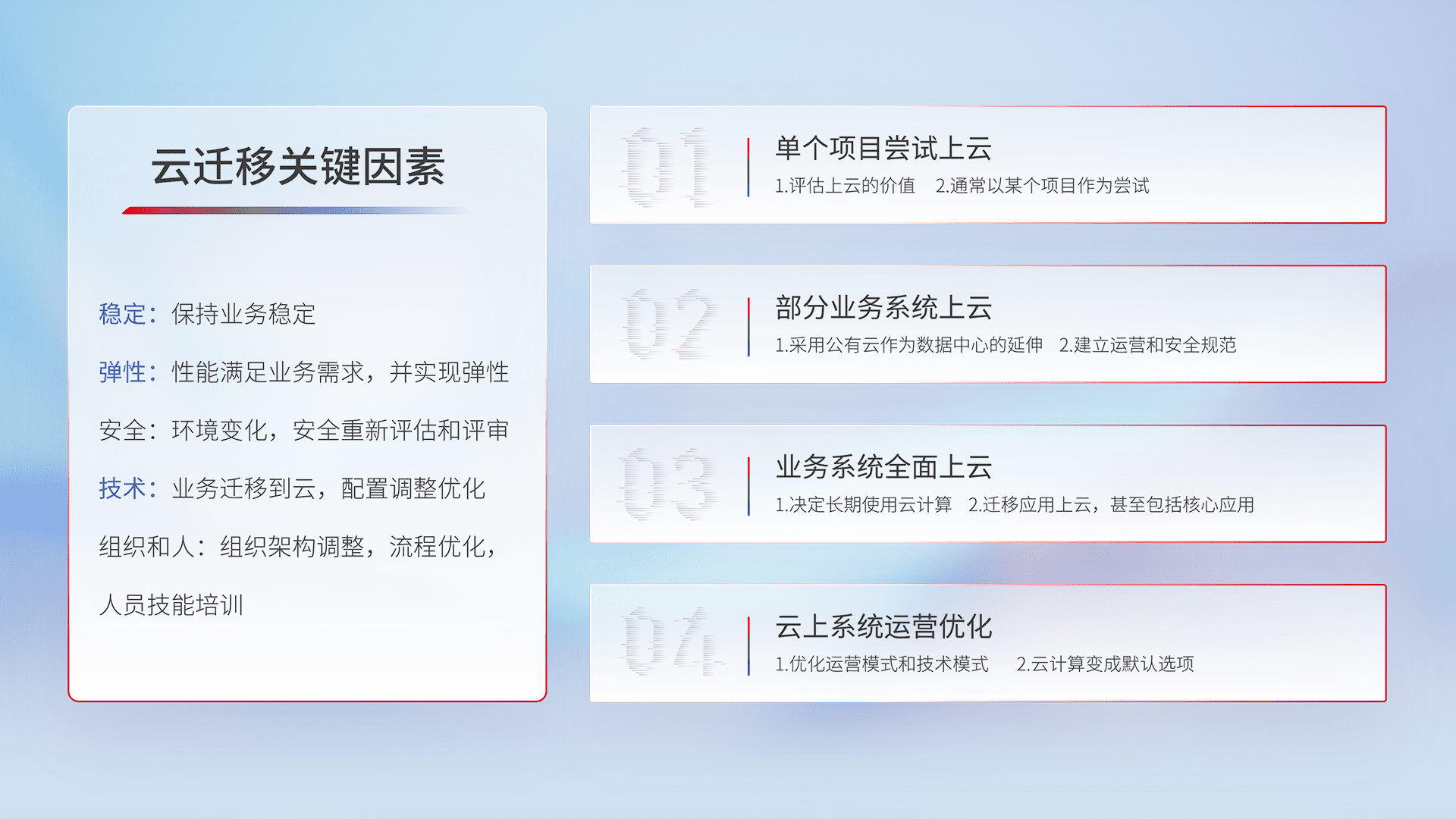 结合实际业务,,从规划设计、、云平台选型、、、云原生改造、、数据迁移、、、、集成交付,,,迁移全过程为客户识别最佳上云路径,,,做好风险识别管理,,设计网络架构、、、身份权限、、安全审计合规、、、、操作审计、、、、日志审计、、、、监控告警策略、、多站点容灾设计等,,,对云上基础设施进行整体规划,,,,提升IT治理水平,,,,以满足弹性、、、高可用、、、高性能的需求。。