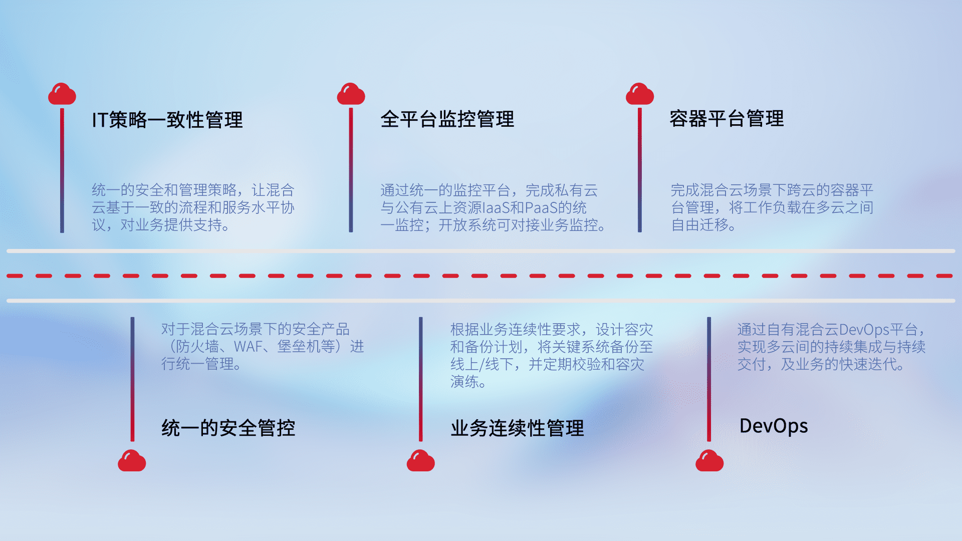 通过多云纳管,,,,以统一的资源数据模型把客户的云资源进行抽象和封装,,,进而实现对多云资源的统一操作,,,保障云资源管理的可靠性、、、、稳定性与可用性。。。。量身定制化运维内容,,,配置、、、、开发运维、、、补丁管理、、备份、、监控、、认证和访问管理、、、、审计和日常巡检等,,保障在用云过程中的可靠度,,稳定度以及高可用率。。