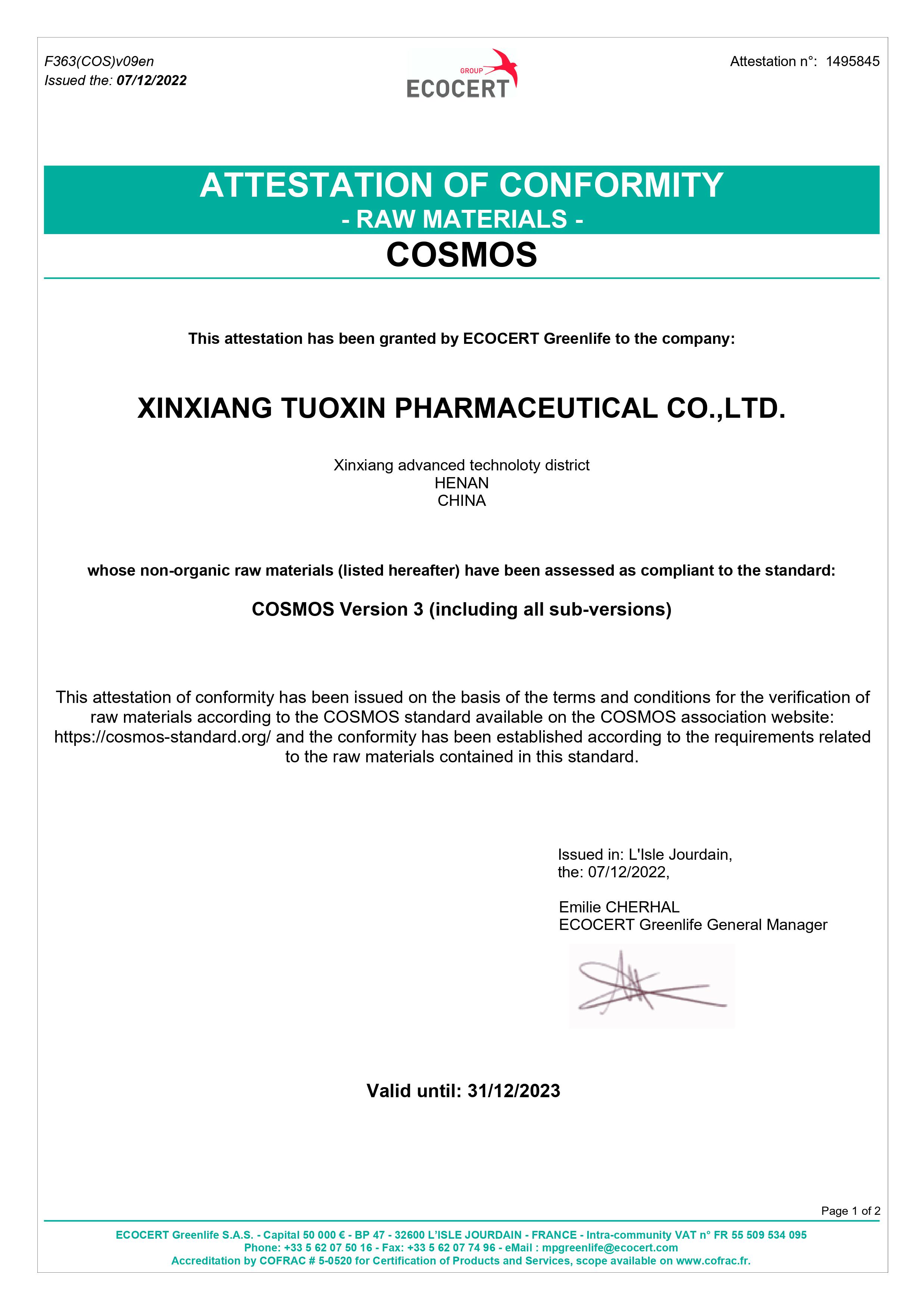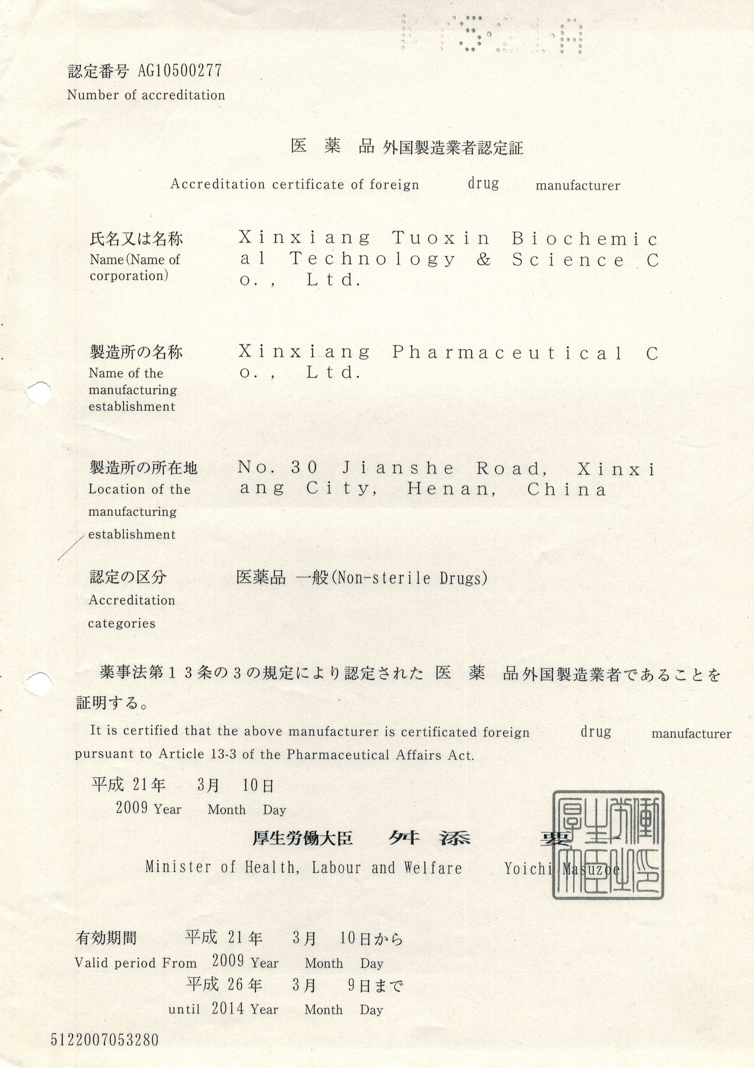集团积极进行各类产品的国内外认证和注册工作,,,,多个子公司产品通过了印度、、、、乌兹别克斯坦DMF认证,,,多个医药中间体产品通过了日本、、、欧盟等国家和地区的官方认证,,,,如欧盟REACH注册证书、、HALAL清真认证和KOSHER洁⻝认证等。。